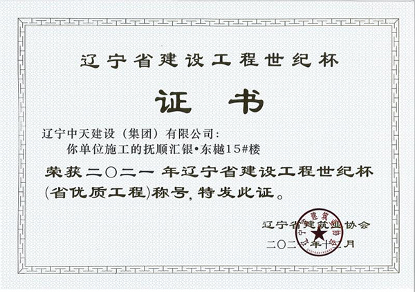 遼寧中天建設集團領導班子認真貫徹落實科學發展觀,堅持以人為本,積極培育“開拓進取,求新向上,求真務實,團結奉獻”的企業精神和“干一項工程交一方朋友,占一方市場,樹一座豐碑”的經營理念。經過遼寧中天建設者的辛勤耕耘,許多建筑精品工程象一座座豐碑聳立在撫順大地上,令人矚目。撫順市保障性住房建設工程榮獲全國優質工程金獎,撫順移動通訊綜合樓、撫順市電信綜合樓、撫順市三寶屯污水處理廠擴建及中水回用工程等多項工程獲得“遼寧省世紀杯工程”、“遼寧市政金杯”工程等殊榮。公司還多次榮獲“省建筑業質量管理先進施工企業”稱號。